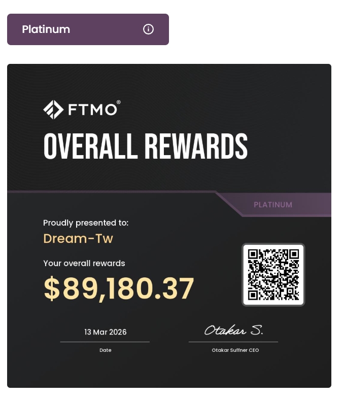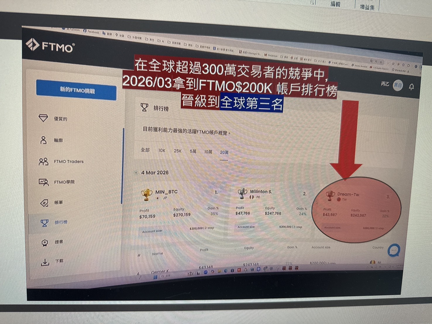 我是 王秉羿 (Dream),《框住財富》交易法的創立者。2026 年 3 月 4 日,我以 FTMO $200,000 帳戶規模成功結算獲利,取得全球排行榜第 3 名(前 0.1% 頂尖交易者)。